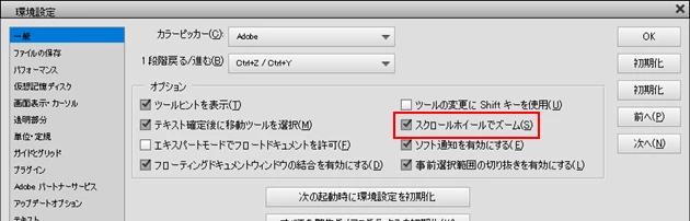 メニューの「編集」→「環境設定」→「一般」を選択し、開いた「環境設定」ウィンドウで、「スクロールホイールでズーム」にチェックを入れ、「OK」をクリックします(下図)。