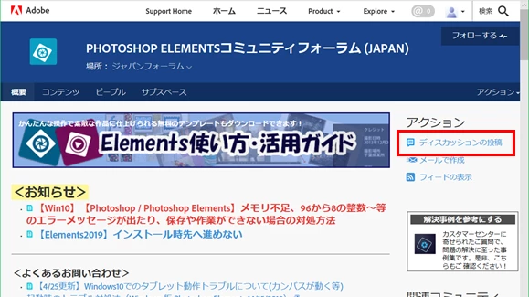 「Photoshop Elementsコミュニティフォーラム」ページで「ディスカッションの投稿」(下図赤枠部)をクリックすると新しく投稿を起こすことが出来ます。