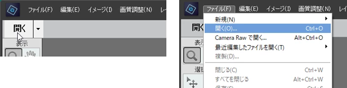 ①左上隅の「開く」(下左図)をクリックするか、メニューの「ファイル」→「開く」(下右図)を選択します。