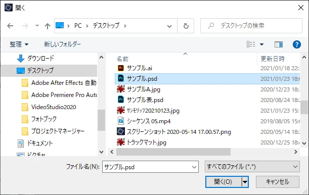 ②開いた「開く」ウィンドウで、フォルダーとファイルを指定し、「開く」をクリックします。