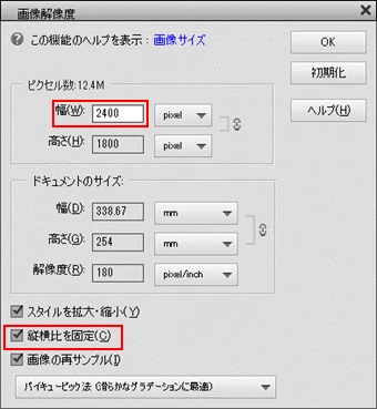 Photoshop Elementsでメニューの「イメージ」→「サイズ変更」→「画像解像度」を選択し、開いた「画像解像度」ウィンドウ(下図)で、