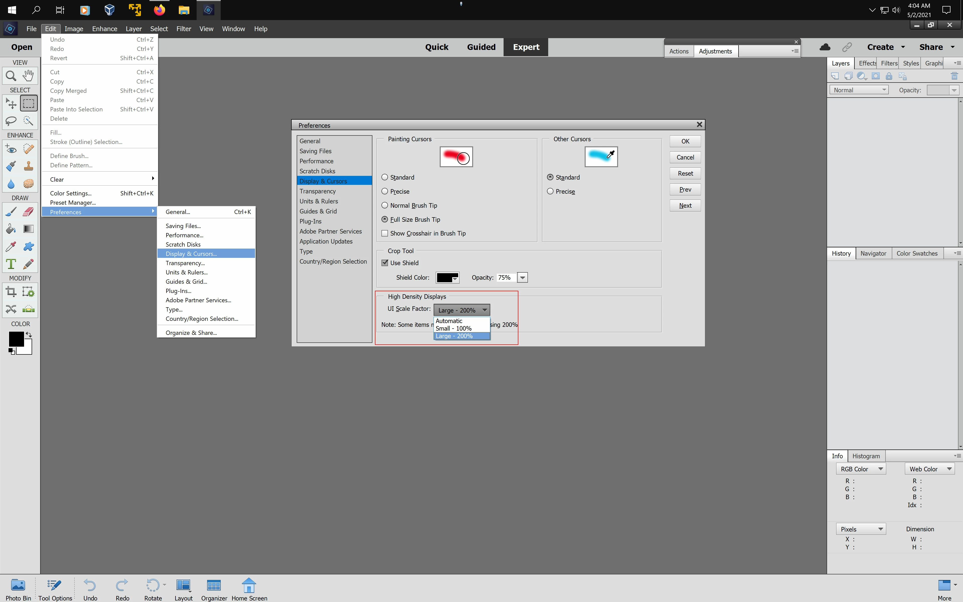 Go to Edit>Preferences>Display & Cursors, set the Ui Scale Factor to Large-200% and restart photoshop elements.