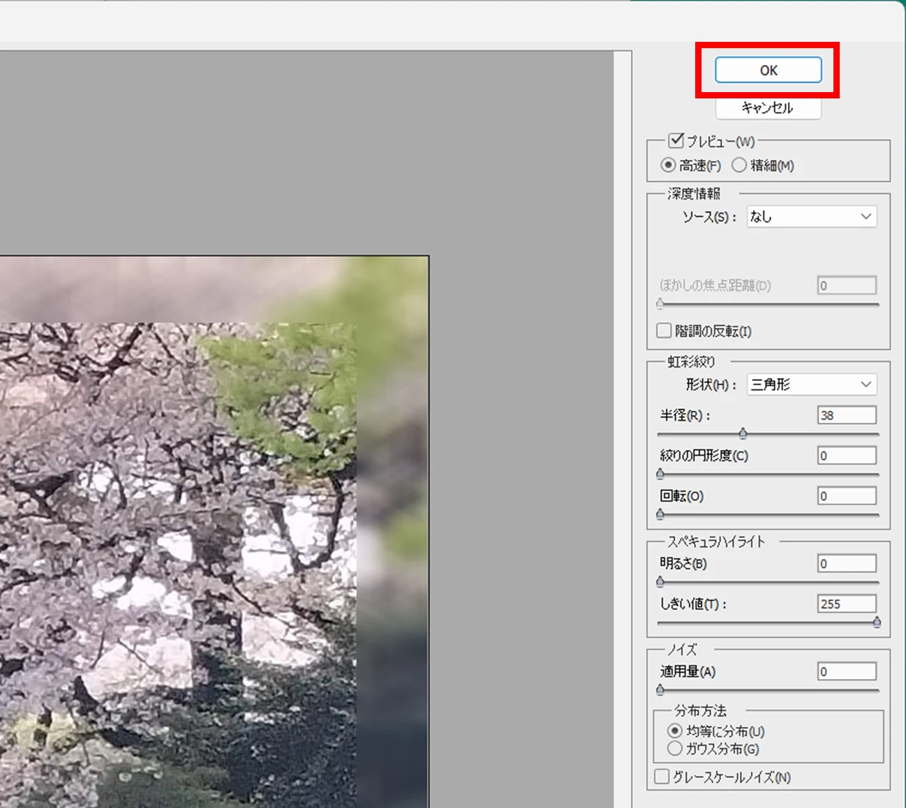③右側のパラメーターで、ぼかし加減を調整し、「OK」をクリックします。