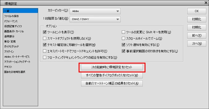 ①「環境設定」→「一般」を開き、「次の起動時に環境設定をリセット」(下図赤枠部)をクリックし、続いて「OK」→「OK」をクリックした後、Photoshop Elements 2019を再起動します。