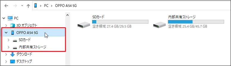 すると、PCのエクスプローラーにスマホの機種名のフォルダーが表示されますので、PCからスマホのフォルダーにアクセスしてファイルを取り込むことができます。