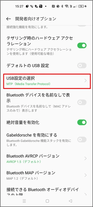 「設定」→「システム設定」→「開発者向けオプション」ページを開き、「開発者向けオプション」項が「オン」になっていることを確認し、「USB設定の選択」項を「MTP(Media Transfer Protocol)」に設定します(下図)。