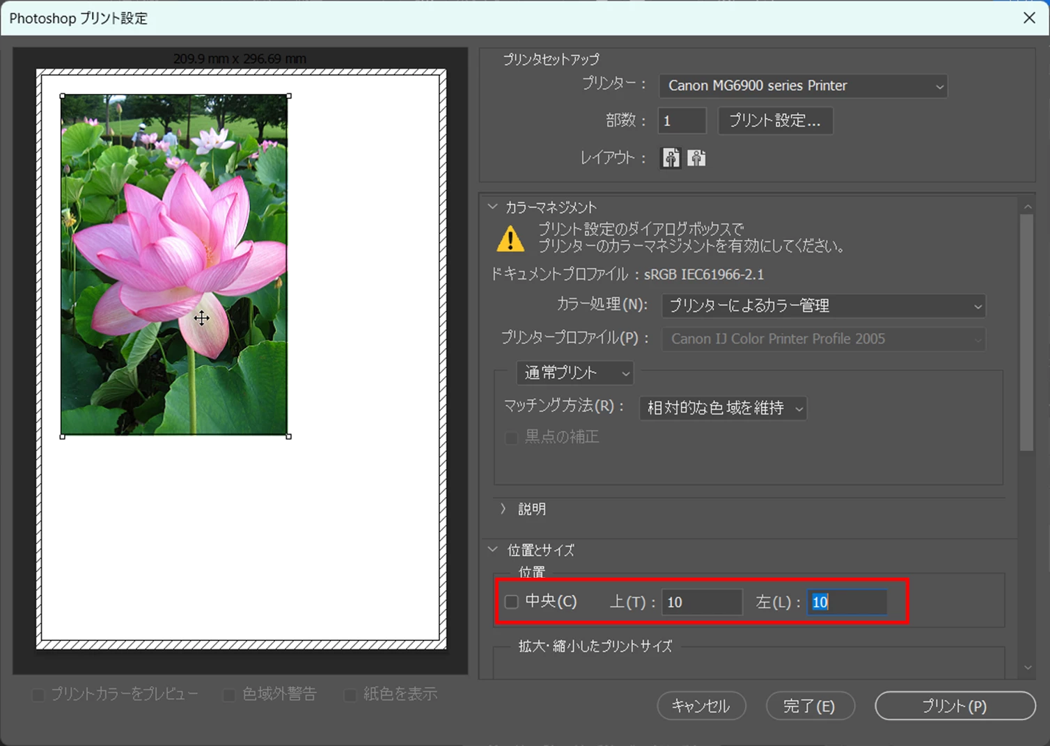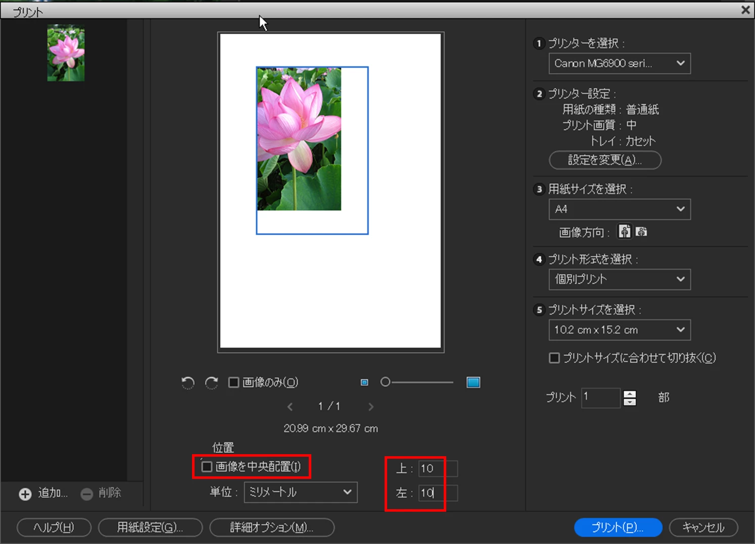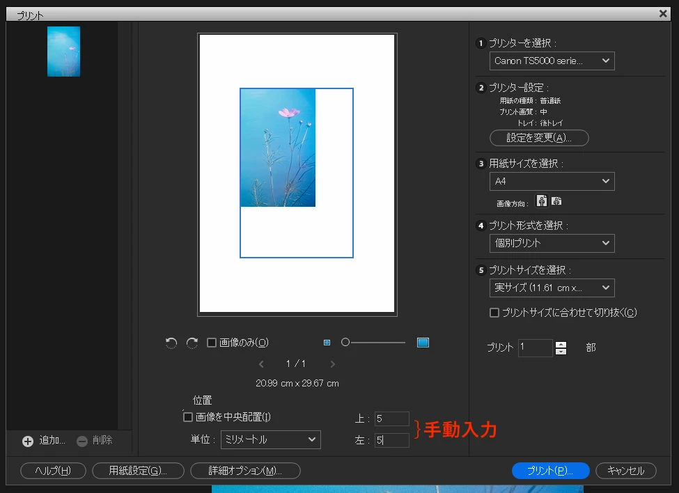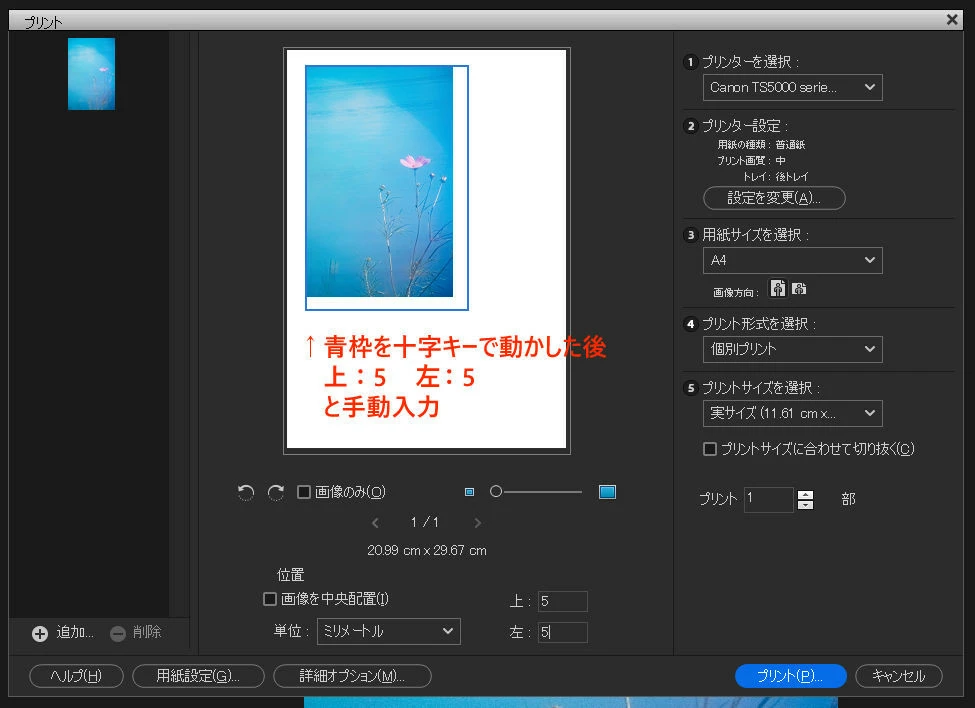 これは「画像を中央配置」を解除後、上、左から5mmの位置に印刷するよう指定した状態です。