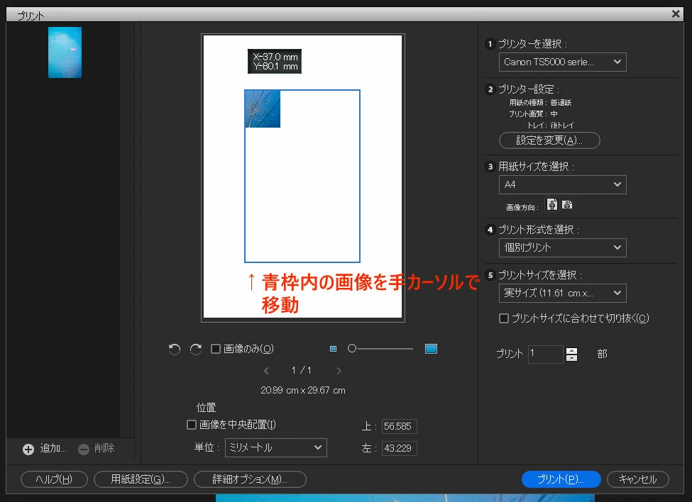青い枠は動かないまま中の写真だけが動き、この状態で印刷すると見切れた状態で出力されます。