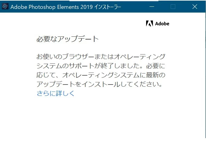 ケケロ*ParticipantForum|Forum|4 years agoJuly 26, 2021Question「必要なアップデート」というメッセージが表示され、購入済製品をインストールできない件Forum|Forum|4 years agoJuly 26, 20214 replies12305 viewsPC入れ替えに伴い、前のPCにて利用してたPhotoshopElements2019の移行を試みました。アドビアカウントの登録製品ページからインストールしようとしたところ、「必要なアップデート」というメッセージが表示され先へ進めません。 尚、前PCでは従来通り利用できております。 解決方法をご教示いただきたくよろしくお願いいたします。 製品:PhotoshopElements2019(インストール版)OS:Windows10IE:バージョン21h2ダウンロードとインストール問題またはエラーWindows