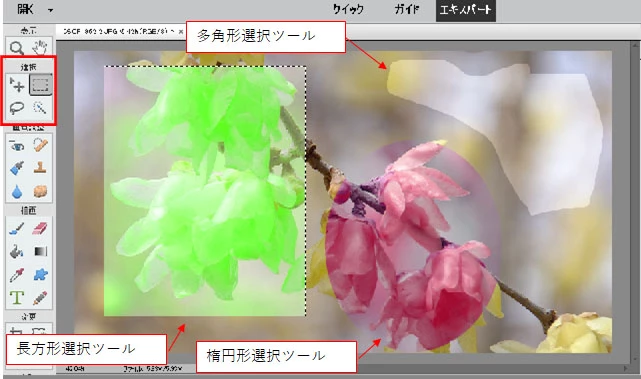 フォトショップエレメント21で特定の部分のみの色の変更したいのですが、色相、彩度、明度で編集すると画面全体に色が変る為、部分のみの変更方法を教えてください。