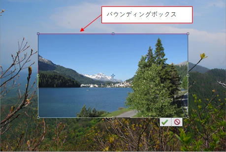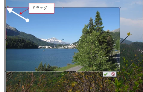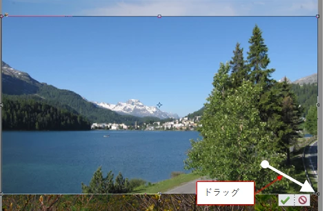 右下のハンドルを大きい画像の縦の辺迄ドラッグします。ドラッグが終了したら✔印をクリックします。