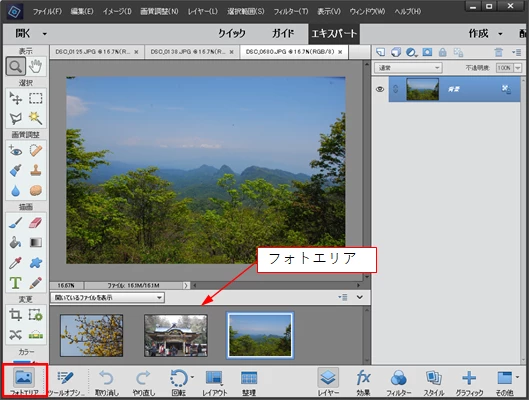 ①3個の画像を開き、「フォトエリア」ボタン(下図赤枠部)をクリックして「フォトエリア」を表示します。「背景」レイヤーにする画像のサムネールを選択します。するとワークスペースにも表示されます。
