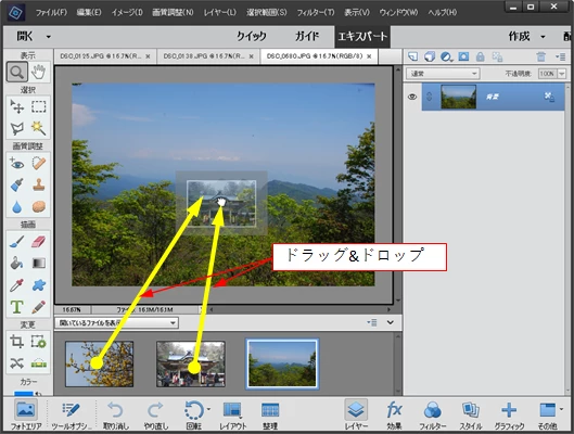 ②続いて、重ねる画像サムネールを「フォトエリア」からワークスペースへドラッグ&ドロップします。