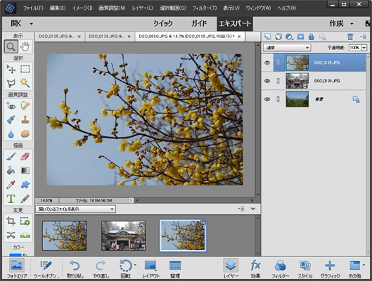 ③すると3個の画像が重なります。重なりは、「レイヤー」パネルを見れば分かります。