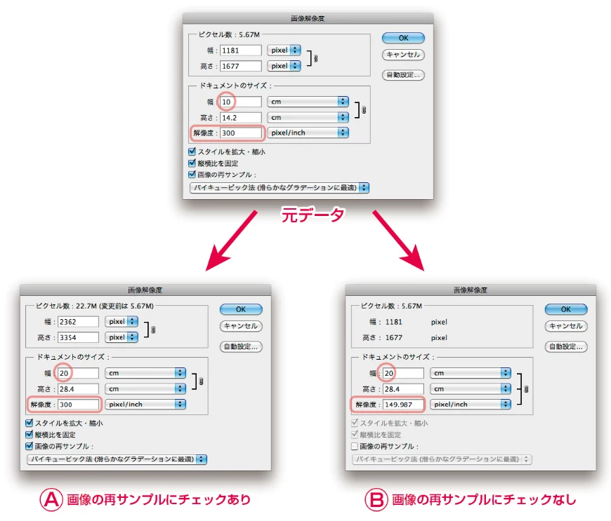 ・「画像解像度」設定画面 「解像度→300」、「画像の再サンプル→チェックなし」