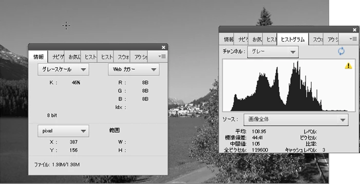 Photoshop でのヒストグラムとピクセル値の表示
