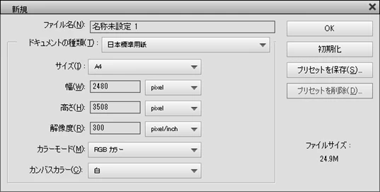 ①白紙ファイルを作成します。A4サイズを指定し、幅・高さは単位pixelで入力します。解像度は印刷の品質に応じて決めてください。ここでは300ppiにしました。