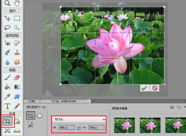 ③蓮の花の画像を白紙ファイルへドラッグ&ドロップします。続いて、「切り抜きツール」を選択すると画像内に枠が表示されます。「サイズ」を「カスタム」にして、「w;945 px」(8cm)と「H;709 px」(6cm)のように数値(比例計算で算出します)と単位を入力します。