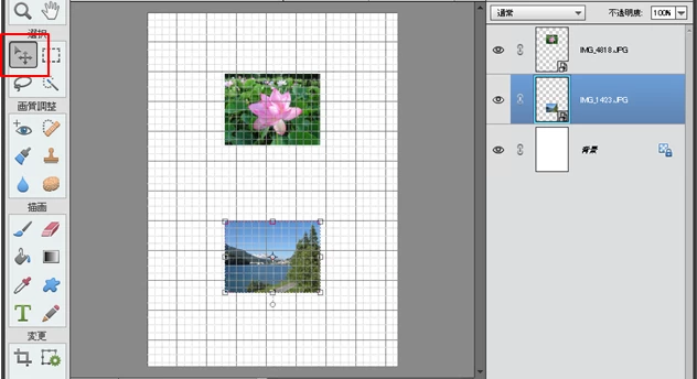 ⑥「レイヤー」パネルで画像を選択し、「移動ツール」で画像を最適な位置に移動します。これを2個の画像に対して行います。この時グリッドを表示させると作業しやすいです。