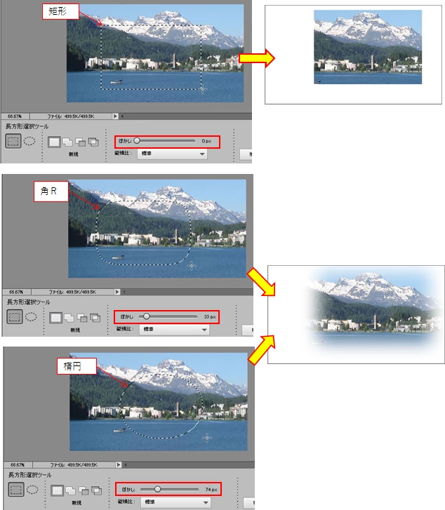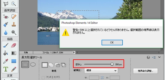 保存してあるPhotoshopElements14で作成済のPSDファイルを開き、長方形選択ツールで指定したい範囲をドラッグすると、以下の警告が表示されます。