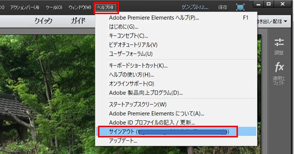 ライセンス認証の解除は、Photoshop Elements 12およびPremiere Elements 12ともメニューの「ヘルプ」→「サインアウト(・・・・・)」を選択すればOKです(下図赤枠部、下図はPremiere Elements 12の場合です)。詳細は下記リンクを参照ください。