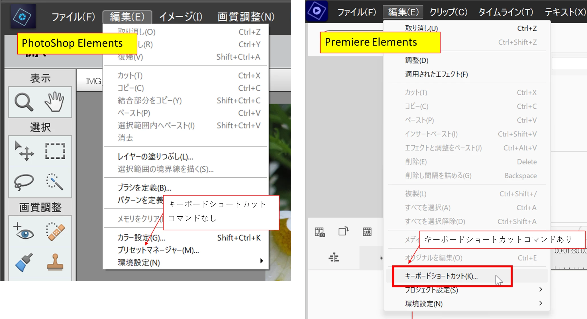 macで Photoshop Elementsを使用しています、ショートカットのないメニューにショートカットキーを追加できますか?