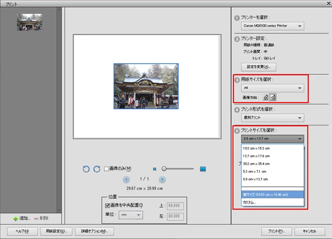 フォトショップエレメンツをwindowsXP で使っていましたが パソコンを買い替えると同じソフトが使用できず エレメンツ12を購入しインストールしたものの 使い方が全く違うので訳がわかりません。免許証をスキャンして印刷すると A4サイズの用紙いっぱいに免許証が印刷されます。実物サイズや拡大拡小して印刷する方法を教えて下さい。