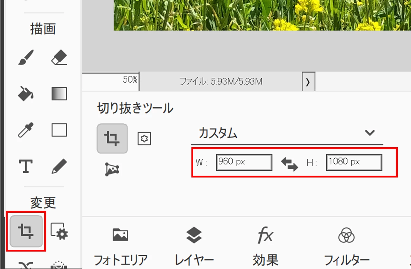 ②「切り抜きツール」を選択し、切り抜くサイズを入力します。単位をmm→pxに変更する場合は、「960 px」と単位まで含めて入力します。