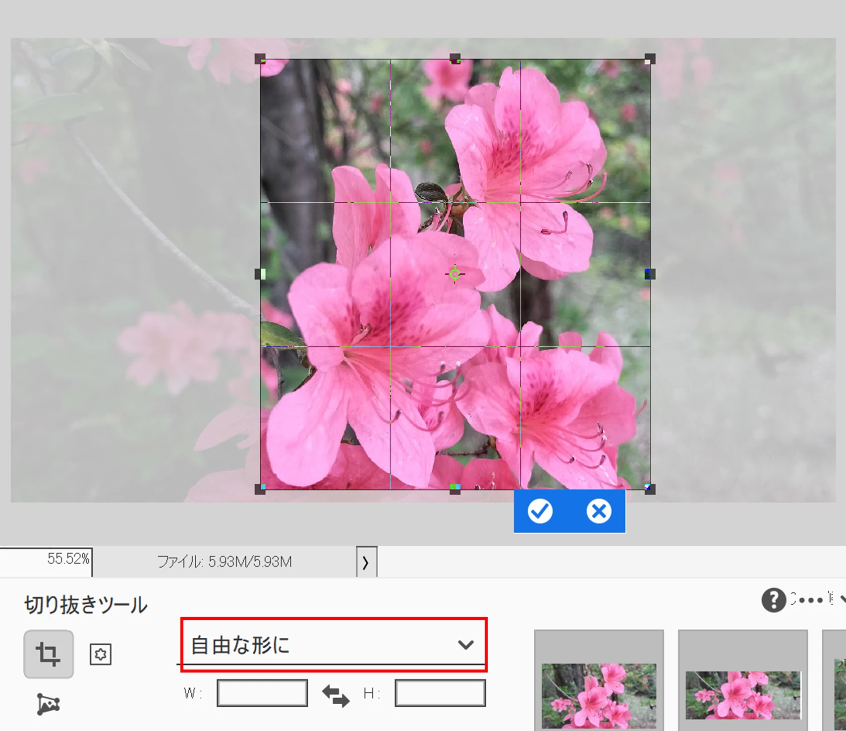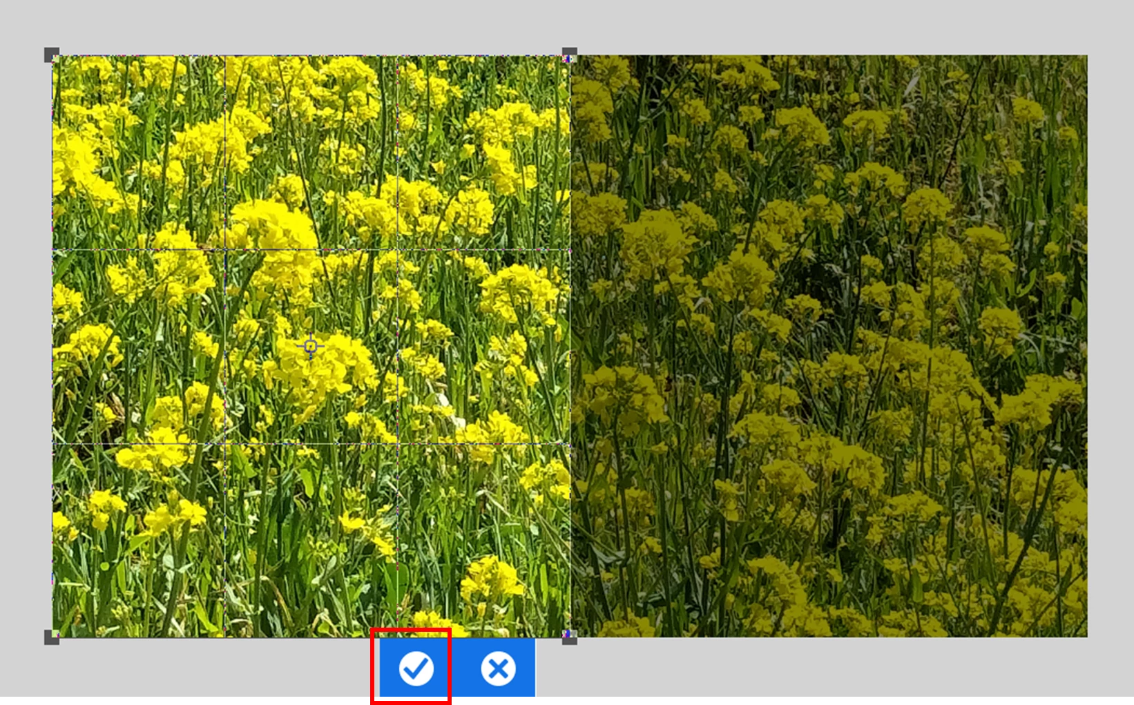 ④ドラッグをやめると、下図のように表示が変わります。明るいところが切り抜かれる部分です。青色部の「✔」をクリックすると確定されます。