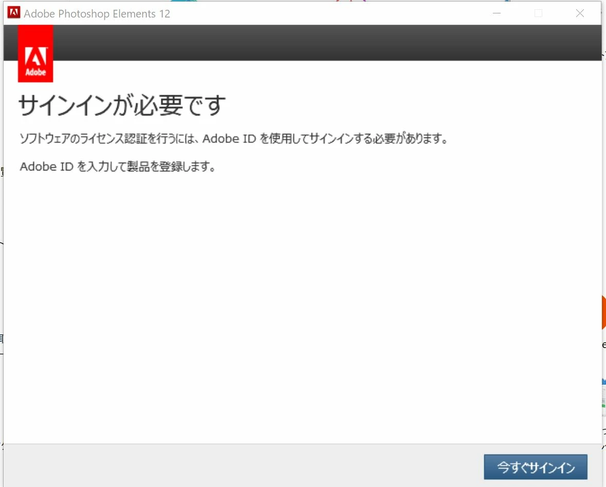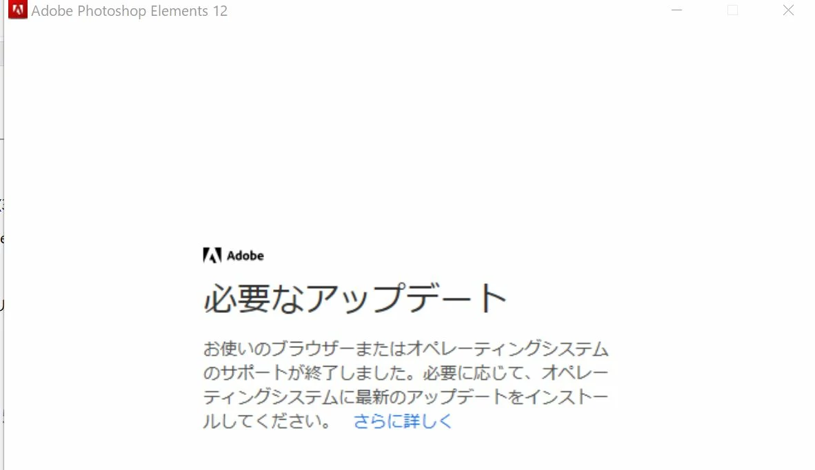 Photoshop Elements 12をこれまでWindws7のPCおよびWindws10のPCで使っていました。先日Windows10のPC上のPhotoshop Elements 12が不調になったため,アンインストールして再インストールし,起動しましたところ,「サインインが必要です」と表示され,右下に表示された「今すぐサインイン」をクリックすると,「必要なアップデート」と表示され,「Photoshop を正常に使用するためOSを最新の状態にアップデートしなさい」と表示されまして,右下の「さらに詳しく」をクリックすると次のHPが表示されます。