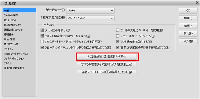 メニューの「編集」→「環境設定」→「一般」を選択し、開いた「環境設定」ウィンドウで、「次の起動時に環境設定を初期化」(下図赤枠部)をクリックし、続いて「OK」→「OK」とクリックして「環境設定」ウィンドウを閉じ、Photoshop Elementsを再起動します。その後、コピー&ペーストを試してみてください。