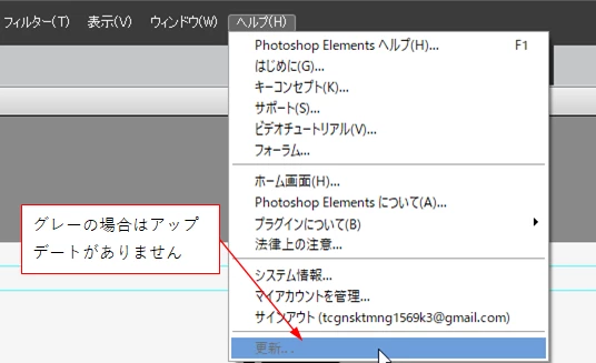 通常はメニューの「ヘルプ」→「更新」を選択してアップデートすることができます。但し、「更新」がグレーで選択できない場合はアップデートがないということです。