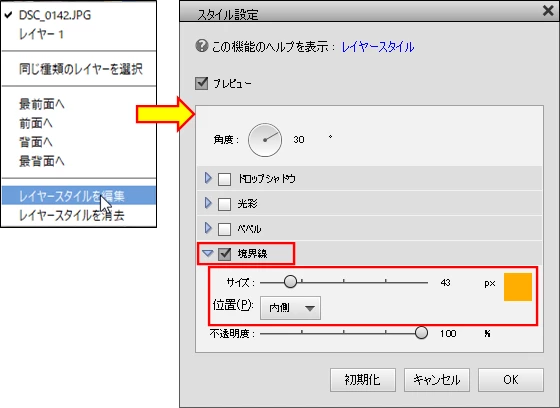 その画像の上で右クリックし、開いたコンテキストメニューから「レイヤースタイルを編集」を選択して開いた「スタイル設定」ウィンドウの「境界線」にチェックを入れ、サイズと色と位置を設定し「OK」をクリックします(下図)。