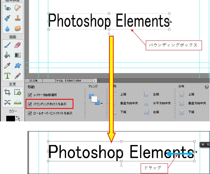 その場合は、「移動ツール」でテキストの上をクリックしてバウンディングボックスを表示させ、右端か左端中央のハンドルの上へカーソルを置き、双方向矢印に変わったらバウンディングボックスを広げる方向へドラッグします。