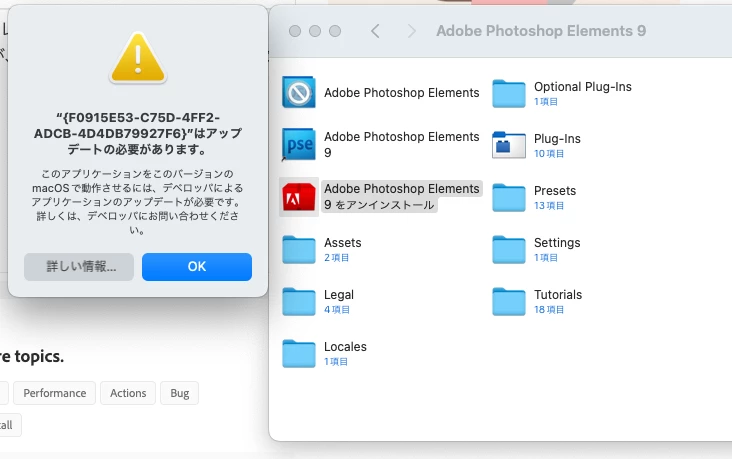 つい先日、macOSをEl Capitan → Monterey にアップグレードしました。Photoshop Elements 9 が使えなくなることはわかっていたのですが、アンインストールができなくなってしまい困っています…。