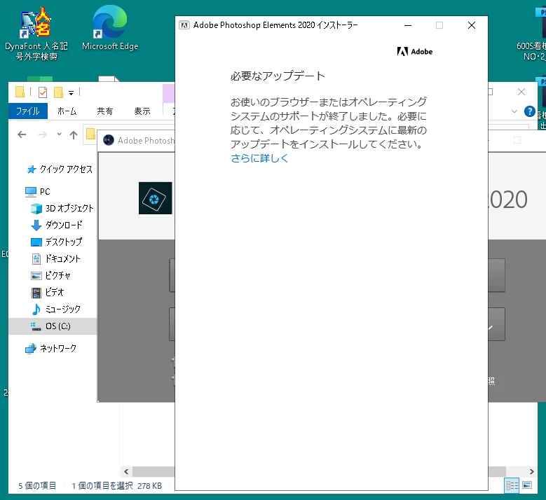 お世話になります。早速ですが、Photoshop Elements2020の編集モードを起動するとログインを要求され、その後の画面で「必要なアップデート お使いのブラウザ―またはオペレーティングシステムのサポートが終了しました。必要に応じてオペレーティングシステムに最新のアップデートをインストールしてください。」と表示されそれ以上進みません。Windows環境でOSはWindows10 64Bit バージョンは20H2 Internet Explorerは11です。(既定のWebブラウザはGoogle chrome)Windowsアップデートは幾度もかけて最新の状態です。再起動も幾度かかけても変わらない為、再インストールを行おうとするとセットアッププログラムが立ち上がる所で上記同様のメッセージが出てインストールすらできない状況です。どなたか解決策をご存じの方はおられないでしょうか。