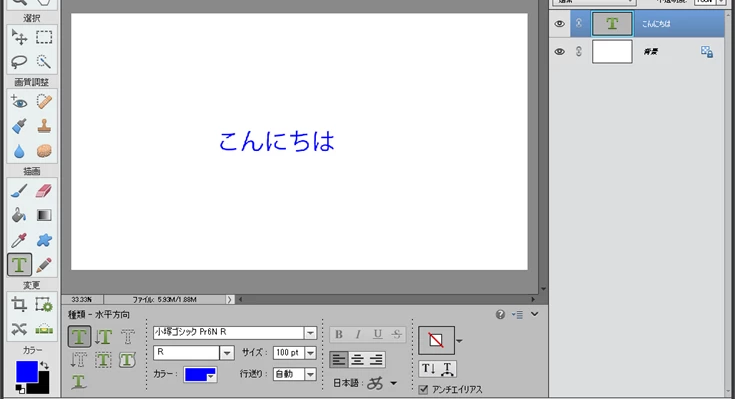画面右側のレイヤーのところには入力した文字が見えますが作業中の画面には