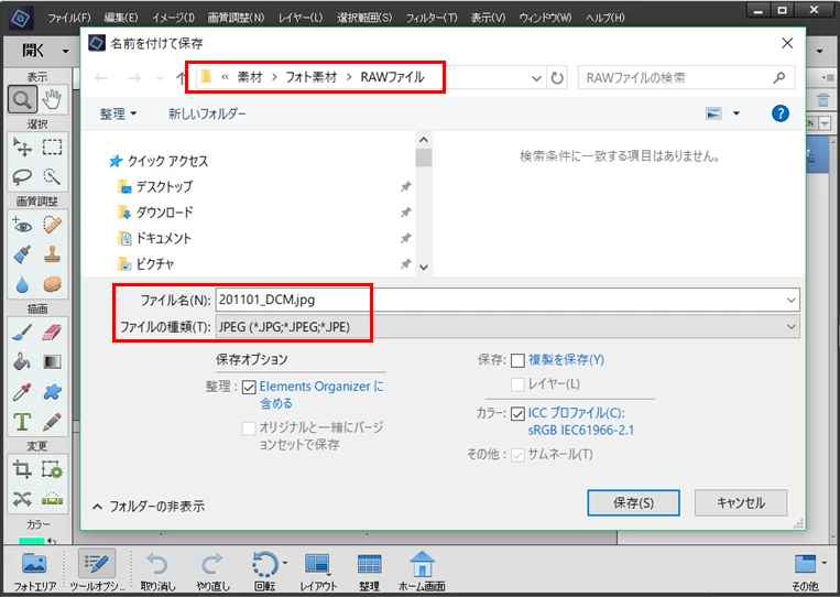 保存するをクリックするとrowかjpegが選択できないまま、勝手に保存が始まってしまい、そのファイルがどこに保存されてしまったのかもわからなくなってしまいます。