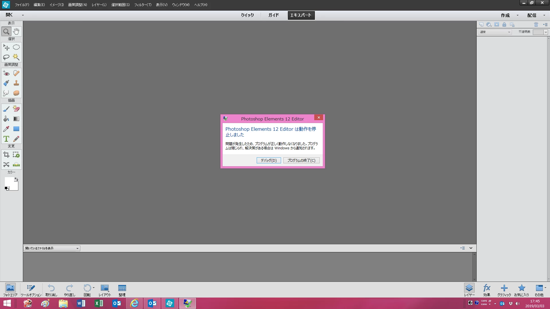 Windows8.1上で使用しているPhotoshop Elementsが、ここ約1ヵ月ほど、開くとすぐに「Photoshop Elements 12 Editor は動作を停止しました 問題が発生したため、プログラムが正しく動作しなくなりました。プログラムは閉じられ、解決策がある場合はWindowsから通知されます。」というメッセージが表示されて終了してしまいます。