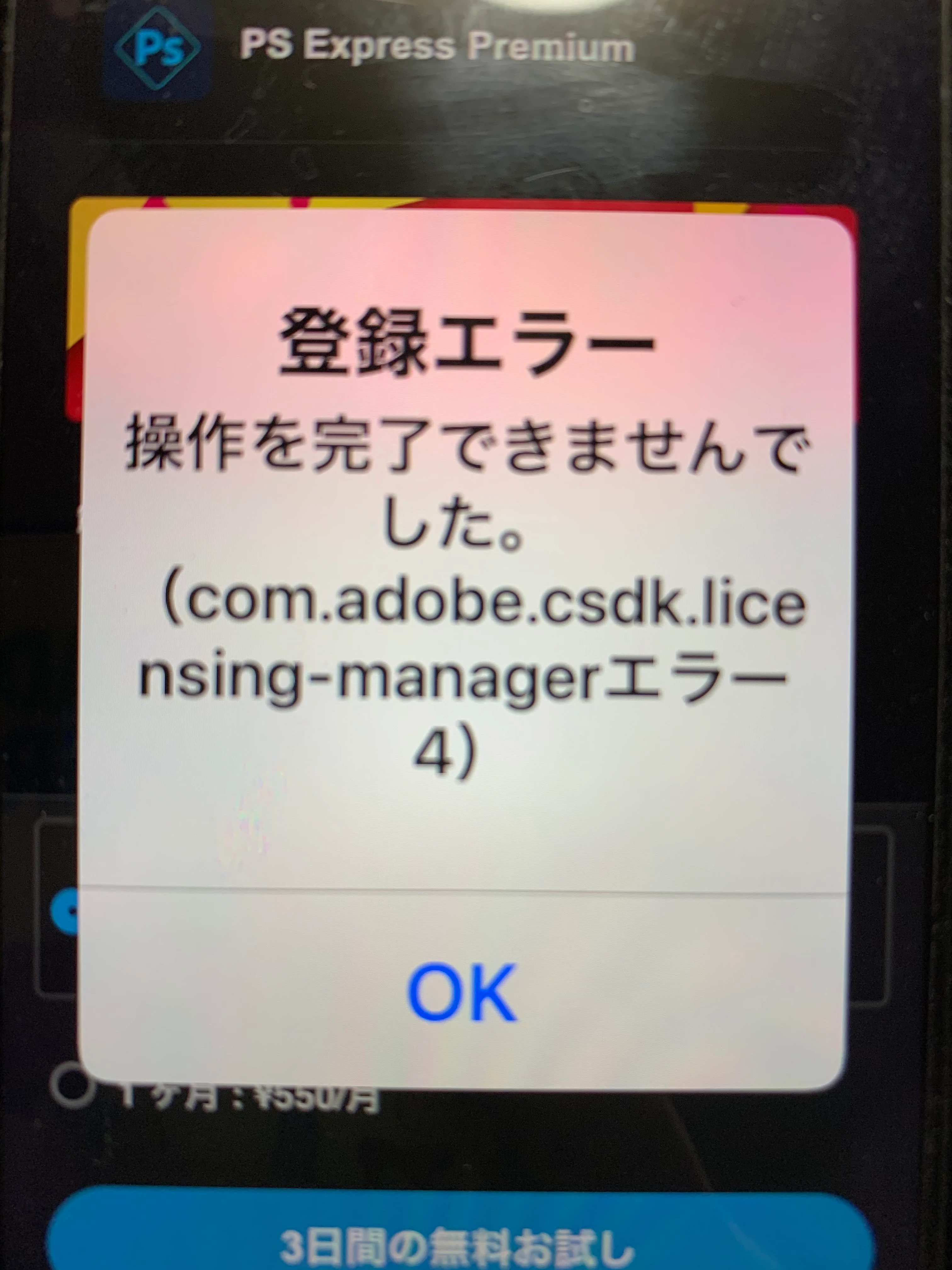画像を加工し、右端から2番目のアイコンを押したのちカメラロールを押すとプレミアムコース紹介の広告が出てきます。その広告を左上の×を押すと「編集を破棄する」か「続行」するか問われます。続行を押すと「Com.adobe.csdk.lice nsing-managerI5-4エラー」と出て編集画面に戻され編集を無かったことにさらてしまい画像も保管できません。