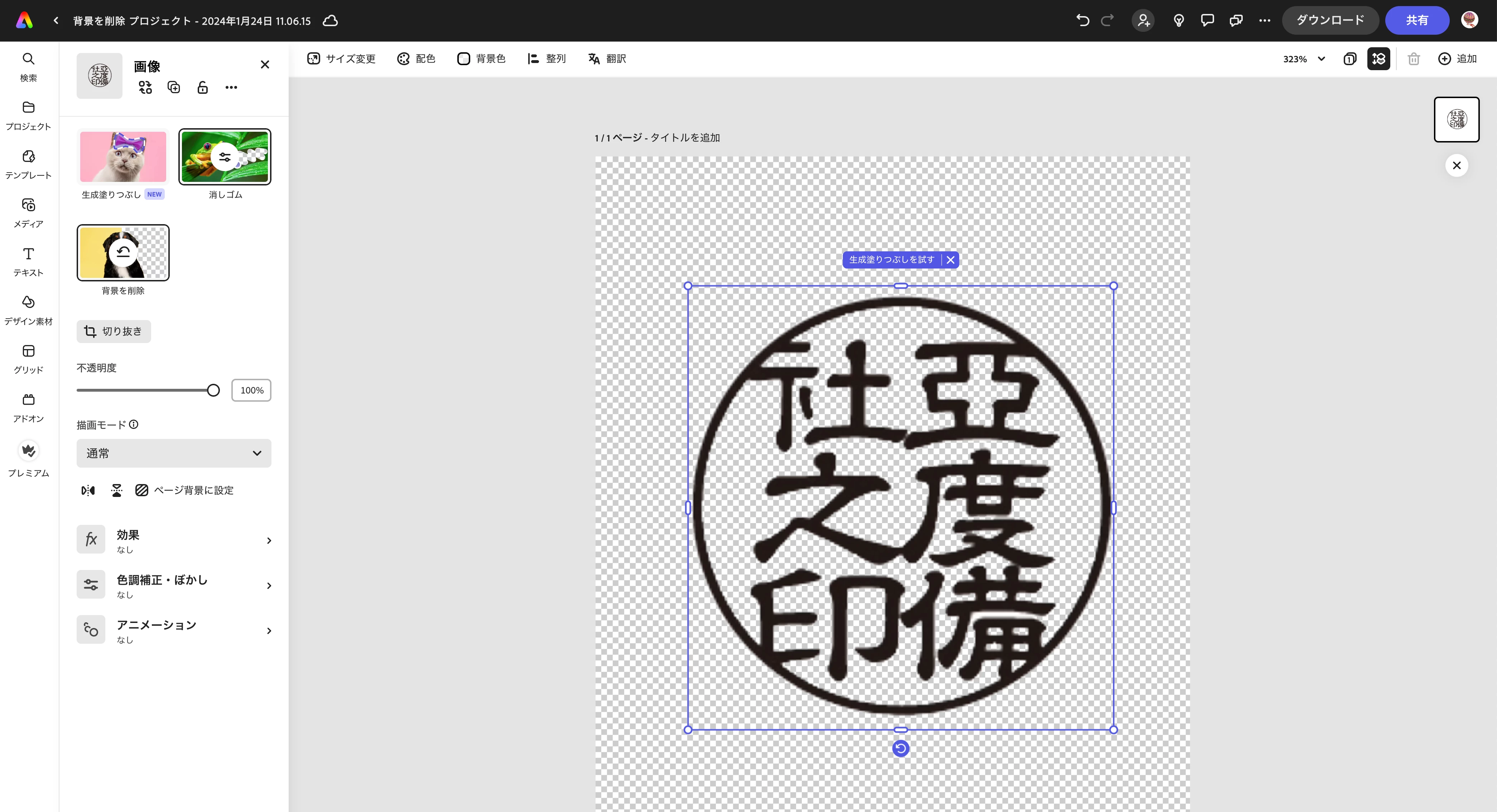 AaysicorazonParticipantForum|Forum|2 years agoJanuary 15, 2024質問印影の切り抜きForum|Forum|2 years agoJanuary 15, 2024返信数 3.478 ビューハンコの印影を簡単に切り抜き、背景と合成することは出来ますか? PS expressです