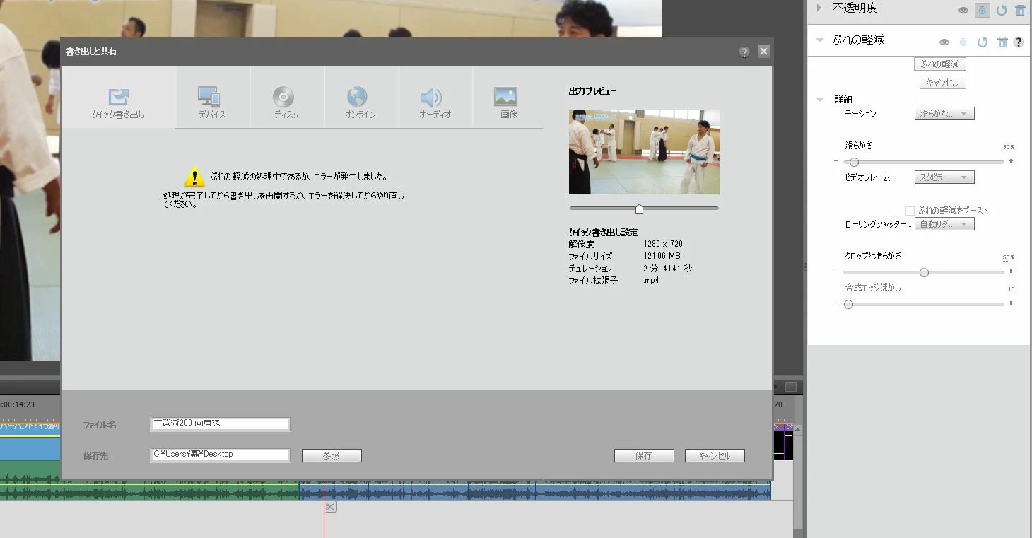 書き出し処理をしようとしたところ「ぶれの低減の処理中であるか、エラーが発生しました。