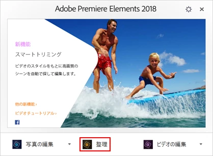 ①スタートアップスクリーンから、「整理」(下図赤枠部)をクリックしてElements Organizerを起動します。