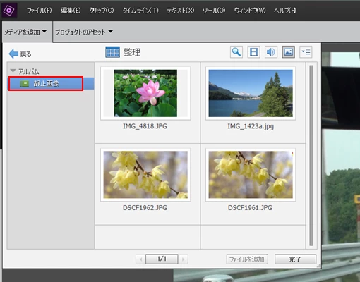 ④開いた「Elements Organizer」ウィンドウで、目的のフォルダーを選択すると(下図赤枠部)、右側に「動画を作成するときに必ず入れる画像」が表示されますので、使用する画像をビデオトラックにドラッグ&ドロップします。