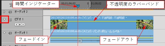 ②「タイムライン」パネルのビデオトラックの左端の▷印(下図赤枠部)をクリックして、ビデオトラックの上下幅を広げます。すると、不透明度のラバーバンドが表示され、既にクリップの最初にフェードイン、最後にフェードアウトがかかっています(下図)。