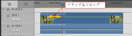 ④フェードインの終了するポイントを時間インジケーター迄ドラッグ&ドロップします(下図)。この操作でフェードインの長さを伸縮出来ます。