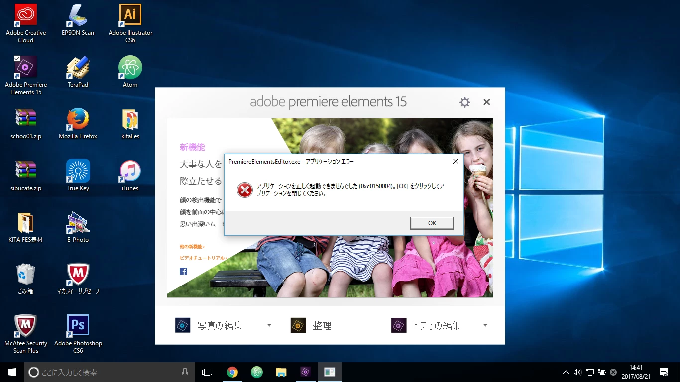 アプリケーションエラーが表示されてプレミアエレメンツ15を起動できません。エラー(0cx0150004)