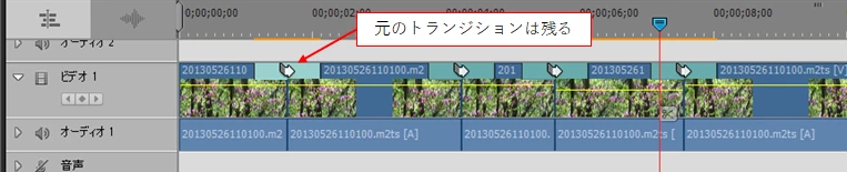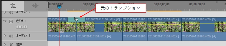 ③トランジションコピー先クリップの境界付近へ再生ヘッドを移動し、「V」キーを押します。