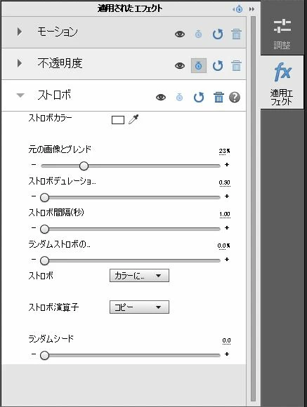 元の画像とブレンド、ストロボデュレーション、ストロボ間隔、ランダムストロボの確立、ストロボ演算子、ランダムシードは、どのように使うので