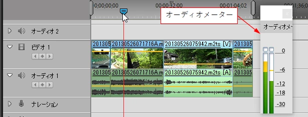 ②タイムラインでその映像クリップを再生してオーディオメーターが振れるか否かを確認します。